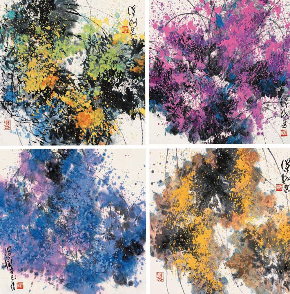 保彬的另一种风貌是融合西画和装饰画法,运用线条和墨彩的运动组合来表现某种即兴的精神感受。看似抽象,实为心象。这种写意不追求细节的具象完美,而凭借感觉和画兴,在画面的虚实节奏和韵律变化上经营位置、随类赋彩,抒发自由奔放的激情和悠思。他性格豪放,不拘成法,在整张或几张宣纸上即兴挥洒随意成象,由于有多年的功底和实践,他的即兴和随意,并非无源之水,无本之木,而是似与不似的树石草花之心象。他以心驭笔,混用刷、甩、泼洒、勾点等笔法在色调和韵律的变化中,营造斑斓中的统一和奇险下的丰富,有时在墨色中点染鲜亮色彩,突出生机的跳动。有时在华丽色调里,交错遒劲线条,平添思绪之曲折。这种心画合一的即兴写意,有别于赵无极西方式的“柔和流动”,也不同于刘国松注重技巧的“拼贴”和“水拓”,而是直接用笔墨表现感觉,用感觉重造画境。画家以心入画,自由写心,其笔下的感觉或明丽热烈、或雄放苍茫。蕴含生活思考和东方审美情趣,给人丰富的时空和生命联想,是兼有个人面目和中国特色的现代心象写意,这一融汇中西和装饰画风的艺术创新,尤适于在公共空间以多条屏形式连续展现,其天人合一的瑰丽画境与现代环境相映生辉,很受社会欢迎。和中国古典诗歌相似,这些写意大多乘兴而就,无标题任由读者自由畅想。其纵横挥洒的精神意兴,和出奇制胜的表现方法,生发出绚丽多姿、大象无形的审美效果。让人观之可游可思。其中,有表现对生命和谐的向往,也有赞美自然生机的顽强力量;有抒发不甘平庸、艰辛求索的创新豪气,还有对万千世相和情怀的艺术演绎。这些心象写意或以粗放水墨应物象形,奇而不怪。或用点、线、色、墨的迷离变化,表现造化奇妙及画家对自然和哲理的思考,有奇妙的东方哲学意境。真应了石涛所言“墨海中立定精神,笔锋下决出生活,混沌里放出光明。”