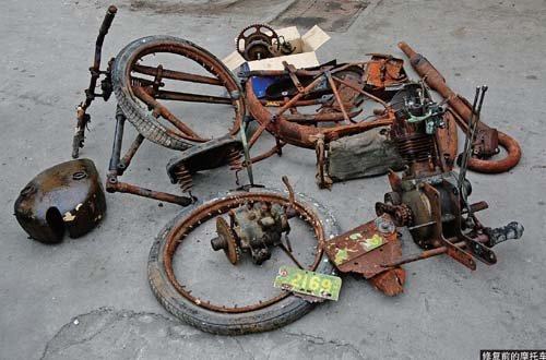 事后我知道,为修复这辆摩托车,张文强厂长亲自组织厂里的技术骨干攻关。他们先把这堆垃圾进行仔细分类,留下可用部分,然后进行清理。就这样关键的发动机出来了,车身出来了,排气管出来了,油箱出来了,就连喇叭、坐垫、大光灯都是原配的。这辆很稀有的摩托车自有它的高明之处:单缸,但有变速挡;容纳混合油的油箱有两个加油口,一个是加汽油的,一个是加润滑油的,两种油在油箱自然混合,很是合理,很是科学。以后几年里,有多家主流媒体和知名的汽车杂志慕名前来采访,一时间这辆摩托车荣升为一位小明星了。说来可能有些夸张,美国哈雷公司亚太区总裁曾试探提议,是否有可能用一辆宝马轿车置换这辆老爷摩托车?因为全世界可能也只有这一辆如此完整的摩托车了。我非常理解这位先生的想法,因为公司需要样本。当然了宝马轿车也非常诱人,但这辆老爷摩托车更是不可再生的文物,我怎么可能同意这笔交易呢?