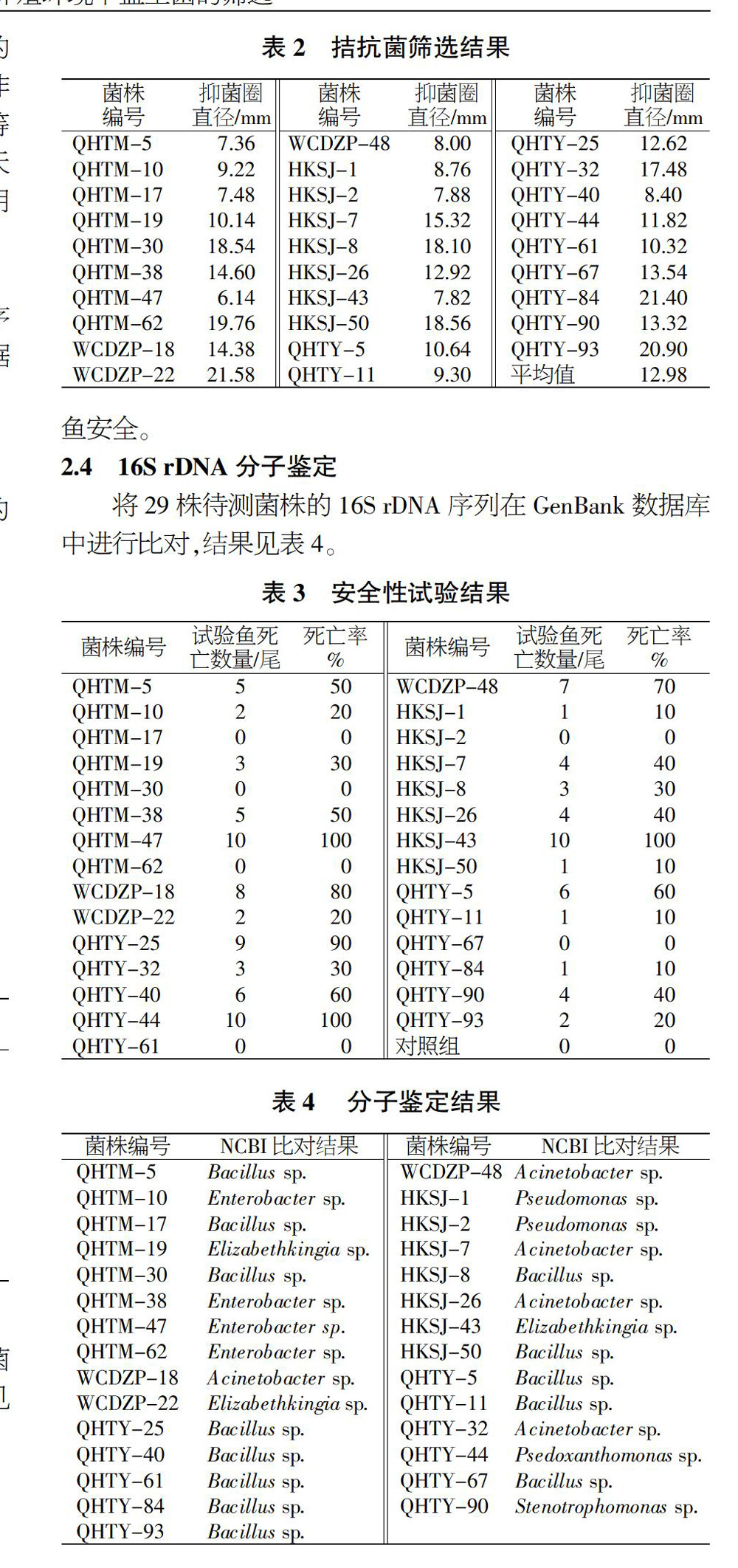 初筛菌株的安全性试验与16S rDNA分子鉴定结果显示,有QHTM-62、HKSJ-2、QHTY-61等6株菌对罗非鱼无致病性,该6株菌分属于芽胞杆菌属、假单胞菌属、肠杆菌属等3个属,其中有4株均为芽胞杆菌,说明无乳链球菌对芽胞杆菌属的细菌表现较为敏感,这与何涛等人的研究结果一致[19-21]。在后续拮抗菌筛选可缩小研究范围,专门针对芽孢杆菌进行筛选,这将大幅度减少工作量。